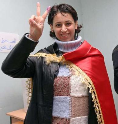 圖:伊拉克婦女投票后做出勝利的手勢