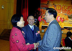一月三十日,“二○○五年廣西首府僑界迎春茶話會”在南寧舉行,三百多名僑界人士到會,世界廣西同鄉(xiāng)聯(lián)誼會主席陳奇培、馬來西亞廣西總會會長孔慶庶等海外僑領(lǐng)也出席了茶話會。廣西自治區(qū)政府副主席劉新文女士(左)、廣西自治區(qū)僑辦主任李漢金(中)和出席茶話會的海外僑領(lǐng)親切交談。作者:劉萬強