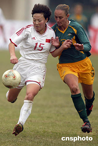 圖為韓端(右)在比賽中。 圖為中國女足十三號劉華娜(左)突破對方防守。