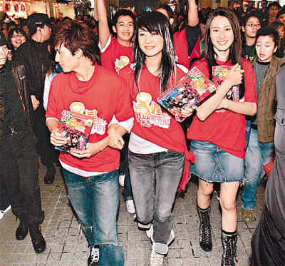 雖然Twins身在臺灣而缺席,但英皇五星的出現(xiàn)同樣哄動,加上打鑼打鼓的舞龍儀式,令現(xiàn)場氣氛推至高潮!熱情的歌迷重重包圍,令五星寸步難行。當(dāng)開始派發(fā)揮春時,歌迷瘋狂上前搶奪,場面一發(fā)不可收拾,為顧及安全,沒到兩分鐘,五星就連忙登車離去。身穿迷你短裙的Isabella,活動未開始前,還表示不擔(dān)心混亂中被摸,但當(dāng)她被擠在人群當(dāng)中,不禁表現(xiàn)驚慌,一直雙手護胸。而Yumiko則由Boy'z的Kenny保護,最后五星在保安開路下離開,此時才可以輕松地向Fans揮手道別。
