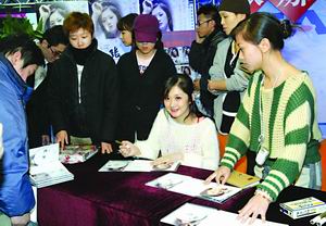 不少歌迷為了能搶占到與娜拉親密接觸的最佳位置,一大早便趕到音像店內等候。當娜拉帶著招牌式的可愛笑容現(xiàn)身時,現(xiàn)場數(shù)百名歌迷立刻炸開了鍋。簽售過程中臺下眾人你推我攘好不熱鬧,拿到簽名的歌迷興奮地聚在一起展示自己的“戰(zhàn)果”,即便是不買專輯的顧客也駐足在人群外觀看。現(xiàn)場近乎失控的局面讓稀有文化工作人員一邊忙著維持臺上的秩序,一邊忙著呼吁臺下歌迷不要擁擠耐心等待。無奈娜拉的無敵萬人迷魅力,讓不少原本負責維持秩序的音像廣場工作人員和保安都被徹底征服,不時地伸長脖子去看臺上的娜拉。而記者通道的管理人員只顧把關記者的進入,絲毫不理會周遭擁擠的歌迷。(朱雅清)