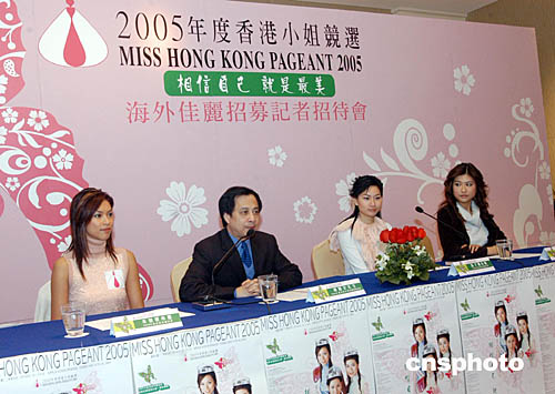 應(yīng)屆港姐冠軍徐子珊(中)、亞軍朱慧敏(左)及季軍符思思(右),2月2日在香港出席《2005年度香港小姐競選》海外招募行動記者會,并于招募海報上簽名,寓意海外招募行動正式展開。