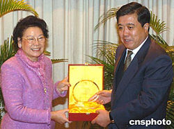 外交部駐港特派員楊文昌(右)2月3日在香港外交部駐港公署接受全國政協(xié)常委﹑中國光彩事業(yè)促進會副會長張永珍博士向外交部扶貧辦公室捐款40萬元港幣﹐在捐贈儀式上楊文昌特派員向張永珍博士贈送紀念品。