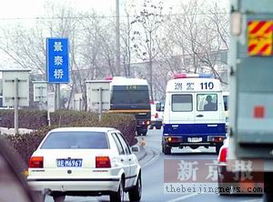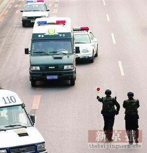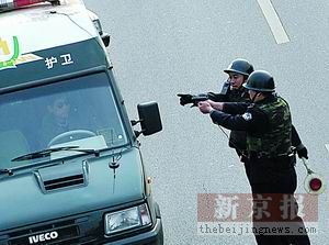 在健宮醫(yī)院西門口,菜市口大街由南向北主路停止行車。三名刑警呈三角狀,站在主路中央。約5分鐘后,三輛警車夾著一輛綠色的運鈔車駛來,在離“三人陣”50米遠處,前排的刑警對運鈔車舉起禁行標(biāo)志。與此同時,兩輛警車向運鈔車靠攏。