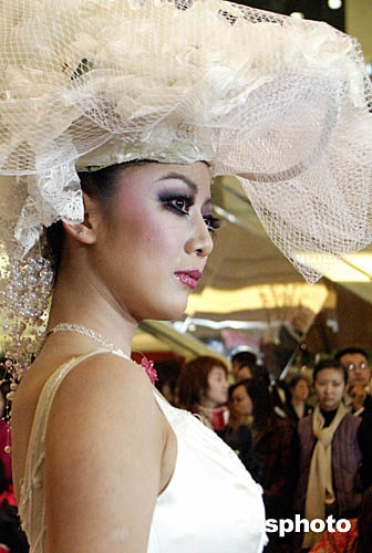 中國傳統(tǒng)春節(jié)將至,北京商家推出多種迎新春促銷活動,在京城一商廈舉行的新春服飾秀上,模特展示新款婚紗服飾。中新社記者:錢興強
