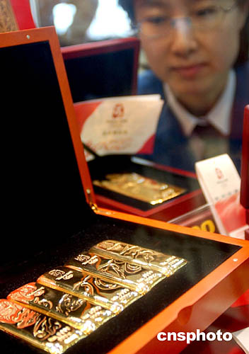 2月4日,北京2008年奧運會會徽紀念性金條——“北京奧運金”在北京正式發(fā)售。這是百年奧運歷史上首獲授權(quán)的金條類特許產(chǎn)品。該金條成色達99.99%,4種規(guī)格分別為50克、100克、500克、1000克,全國限量發(fā)行2008公斤。作者:韓藝冰