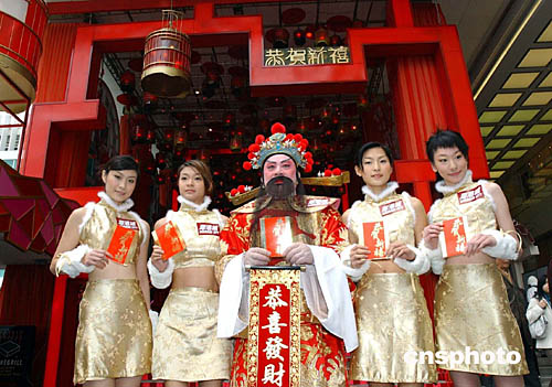 財(cái)神爺與亮麗的旗袍美女在海港城向途人派發(fā)賀年利是