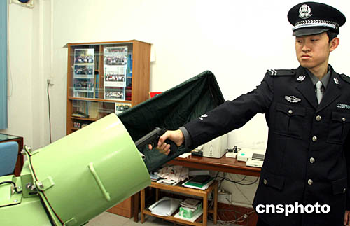 廣東省肇慶市公安局警員正在使用“移動(dòng)式小型消聲抓彈器”。該市公安局研制的移動(dòng)式小型消聲抓彈器填補(bǔ)了國內(nèi)空白。利用該裝置,警方可在不損傷、不破壞彈道痕跡的前提下,快速有效地提取從槍膛中高速射出的彈頭。中新社圖