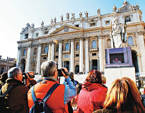 圣彼得廣場的朝圣者上周日聆聽教皇祝福。(路透)