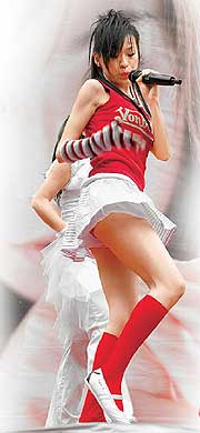 新明日?qǐng)?bào)報(bào)道,昨天下午王心凌在西門町舉行《Honey》簽唱會(huì),展現(xiàn)美少女超人氣,現(xiàn)場(chǎng)擠滿上千男女老幼的歌迷,人手一張專輯和心形氣球,她開(kāi)心地賣力扭腰跳舞,黑白條紋迷你裙不時(shí)裙擺飛揚(yáng),露出里面紅色的安全小褲褲。