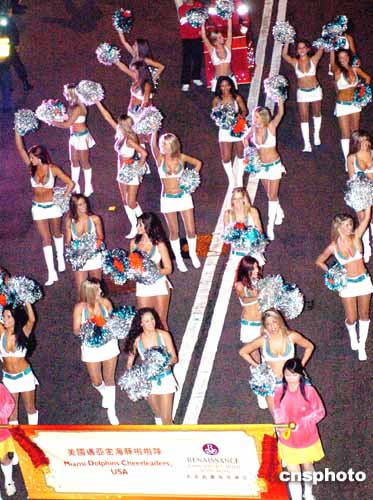 來(lái)自美國(guó)的邁阿密海豚啦啦隊(duì),二十五位貌美女郎,穿著性感上衣及熱褲,手執(zhí)啦啦球勁歌熱舞,齊齊向觀眾道來(lái)“恭喜發(fā)財(cái)!wel-cometoHongKong!”