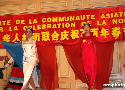 中國(guó)傳統(tǒng)春節(jié)大年初一,法國(guó)巴黎十三區(qū)政府會(huì)議大廳舉行團(tuán)拜會(huì),演員身穿中法兩國(guó)國(guó)旗在臺(tái)上表演,有如中法國(guó)旗飄揚(yáng)在舞臺(tái)。作者:鐘誠(chéng)