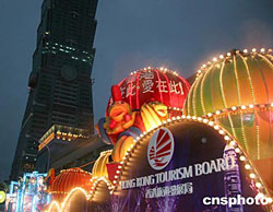 香港、澳門特區(qū)今年再度參加臺北元宵燈節(jié)。燈節(jié)將于本月十九日開幕,預計將有六百萬左右的臺灣民眾到場參觀。香港“金雞報喜詠香江”花車和澳門特區(qū)旅游局贊助的“夢想前進”燈座花車在臺北一〇一大廈旁亮相。作者:曾嘉