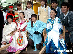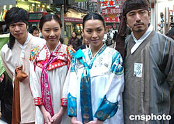 香港演員張文慈等身著韓國服飾20日亮相香港旺角鬧市區(qū)﹐為韓劇《茶母》宣傳造勢。作者:趙振清