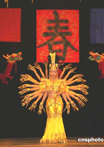 中國殘疾人藝術(shù)團(tuán)二月二十七日在巴黎近郊賽日市舉行的“中國日”活動(dòng)中,表演舞蹈“千手觀音”。該節(jié)目亦將在二十八日舉行的“世界殘疾成果及發(fā)獎(jiǎng)大會(huì)”上演出。圖為著名殘疾人舞蹈家邰麗華領(lǐng)銜為當(dāng)?shù)胤▏^眾和華僑表演。作者:鐘誠