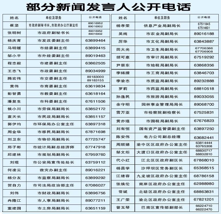 中新網3月1日電 據重慶晚報消息,重慶市政府新聞辦昨日向公眾公布了政府新聞發(fā)言人的電話。據悉,目前,全國只有國務院各部委公開了新聞發(fā)言人電話,在省級政府中,重慶市是第一個。