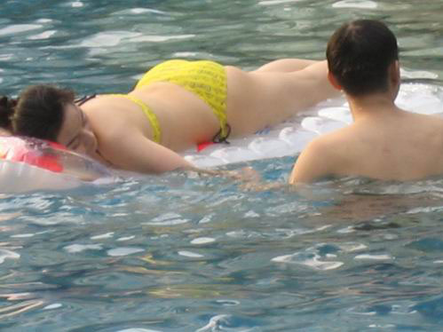 王學(xué)兵于范冰冰現(xiàn)現(xiàn)身海南三亞銀泰獨(dú)家酒店的室外游泳池,隨行的還有一男一女兩位友人。此時(shí)泳池的游客比較稀少,范冰冰毫不吝惜身材,身穿性感的黃色兩件套比基尼入水,而一向缺乏時(shí)尚觸覺(jué)的王學(xué)兵則沒(méi)有選擇正規(guī)游泳褲,而是穿著深灰色沙灘褲便與范冰冰在水中展開(kāi)嬉戲。除了酒店房間提供的沙灘毛巾外,兩人還另外租借了一張用以休息的水上氣墊床。