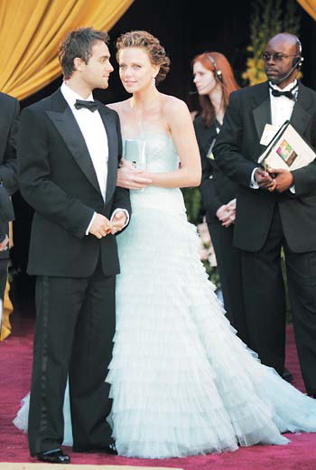 上屆影后查理茲·塞隆的著裝,遠比去年她拿獎時的那身出彩,淡青色的雪紡料長裙,既貼身又下垂,正好將她曼妙的身材凸顯得玲瓏有致;低胸的設(shè)計,再配上同色的薄紗做點綴,顯得明快生動;裙的下部是層層擴大的荷邊式下擺,裙尾略有拖地,恰到好處地彌補了塞隆腰短的缺點,空靈飄逸,幽雅高貴,整體效果非常出眾。