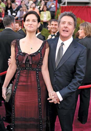 達斯丁·霍夫曼夫婦的衣著也是可圈可點的。太太麗莎一套低胸紅色的長裙禮服大方得體,如果說安妮特·貝寧的黑色禮服體現(xiàn)的是高貴優(yōu)雅,那麗莎的這一身則是生動性感。裙外還配了黑色軟紗,亮銀色的裝飾點綴于裙身和裙擺,顯得明朗而輕快。霍夫曼的筆挺西裝與太太裙子的風(fēng)格搭配得很協(xié)調(diào)。