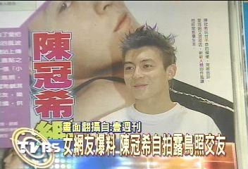 據(jù)TVBS消息,該周刊根據(jù)女網(wǎng)友的爆料,刊登疑似陳冠希的露點(diǎn)照,3張照片中,有2張露臉,第一張是陳冠希面對鏡頭自拍,眼神慵懶的露出招牌笑容,狂電女網(wǎng)友。