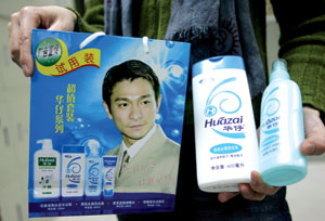 記者見到,在“華仔系列”超級(jí)套裝的宣傳紙袋以及該公司出品的“黑亮去屑洗發(fā)露”的包裝盒以及宣傳單上,印有劉德華面帶微笑、穿著米黃西裝的半身像。據(jù)調(diào)查,印有劉德華形象的各類洗滌化妝用品的出廠價(jià)格低得驚人。一罐1130毫升沐浴露出廠價(jià)僅為3.5元,而在市場上卻達(dá)35元以上。
