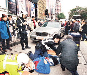 袁潔瑩昨晨十一時(shí)許,駕駛銀色平治房車沿漆咸道南向尖沙咀行駛,途至金馬倫道對(duì)開交通燈位時(shí),一名五十二歲菲籍女子突然由行人路道走出欲過馬路,F(xiàn)ennie剎車不及將對(duì)方撞倒地上,她立即停車報(bào)警。
