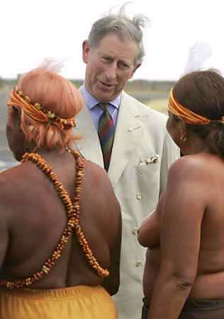 3月2日,查爾斯前往澳大利亞內(nèi)地進行訪問。王儲一抵達愛利斯泉,就由赤裸著上身的土著婦女熱情迎接,王儲看得兩眼不知該往哪里瞧才好。土著人又給他端上一桌蟲蟲大餐,更讓王儲吃不消。