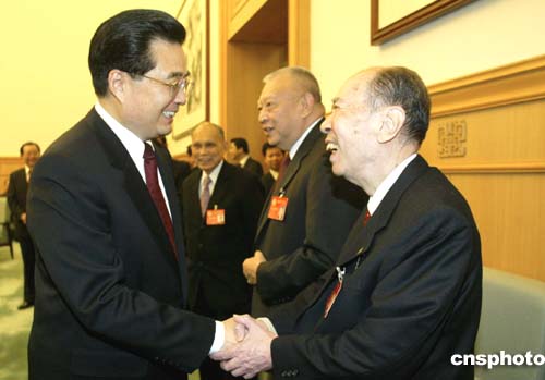 全國政協(xié)十屆三次會議三月三日在北京開幕,國家主席胡錦濤在開幕式前問候出席會議的全國政協(xié)副主席馬萬祺。作者:廖文靜