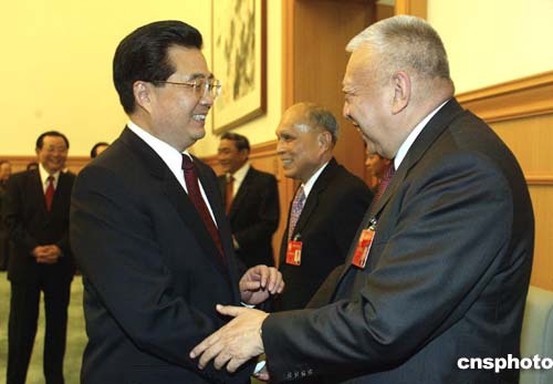 全國(guó)政協(xié)十屆三次會(huì)議三月三日在北京開(kāi)幕,國(guó)家主席胡錦濤在大會(huì)開(kāi)幕前與香港特首董建華互致問(wèn)候。作者:廖文靜