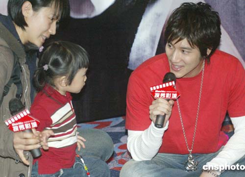 三月三日,在北京舉行的中國實力派創(chuàng)作歌手王力宏新專輯[心中的日月]內(nèi)地銷量突破六十萬慶功會上,一名二歲小歌迷與王力宏一起在現(xiàn)場演唱。作者:錢興強