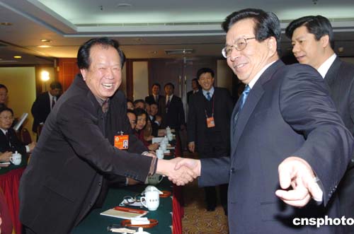 三月四日,中共中央政治局常委、國家副主席曾慶紅到北京華潤飯店參加全國政協(xié)民進、民盟聯(lián)組會議時,應(yīng)著名導(dǎo)演李前寬的要求與其握手。作者:陳文