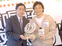 歌星陳奕迅3月4日在香港出席由新城電臺(tái)娛樂臺(tái)主辦‧主題贊助《新城唱好陳奕迅05’出擊音樂會(huì)》記者會(huì),音樂會(huì)贊助商新世界電訊市務(wù)副總裁洪秋偉向陳奕迅頒贈(zèng)記念品以示鼓勵(lì)。音樂會(huì)將于三月二十七日晚假會(huì)展新翼舉行。作者:鄧慶樂