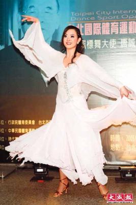 昨晚于臺師大分部舉行的“2005臺北國際標準舞大賽”,邀請中國、丹麥等舞林高手飆舞。劉真特地以一身雪白舞衣,擔任“國標舞大使”唐誠精采舞姿介紹人,她說:“唐誠67歲才開始學舞,我會有今天這成就,受唐誠影響很深!
