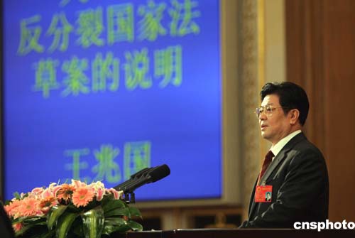 全國人大常委會(huì)副委員長王兆國代表全國人大常委會(huì)在會(huì)上作關(guān)于反分裂國家法草案的說明,介紹了制定本法的必要性和可行性、起草本法的原則和草案的形成以及草案的主要內(nèi)容。