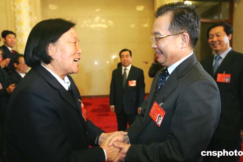 圖:溫家寶與“人大十屆元老”申紀蘭握手