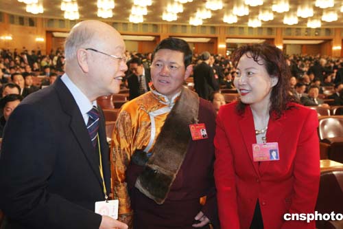 十屆全國人大三次會議第三次全體大會三月九日在北京人民大會堂舉行,出席會議的澳門代表李鵬翥(左一)與青海代表才福旦(左二)、陜西代表于文一起交談西部發(fā)展問題。作者:毛建軍