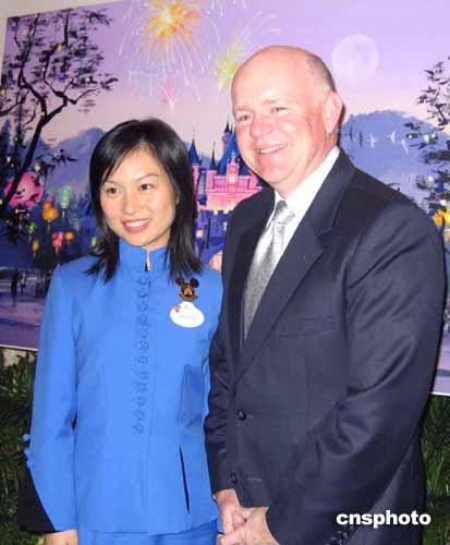 為了在開(kāi)業(yè)前進(jìn)行更好的推廣,香港迪斯尼的第一位親善大使已經(jīng)上任。這位名叫杜苡樂(lè)(左)的“美眉”,祖籍上海,來(lái)自在臺(tái)北,工作在香港,有著兩岸三地的親和力。她與香港迪斯尼集團(tuán)行政總裁羅彬深(右),九日一同出席推廣活動(dòng)。作者:關(guān)向東