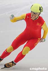 三月十二日在北京首都體育館舉行的二00五年短道速滑世界錦標(biāo)賽女子五百米比賽中,中國(guó)選手楊揚(yáng)、王濛、付天余發(fā)揮出色,包攬前三名。圖為楊揚(yáng)奪冠后慶祝。作者:武仲林