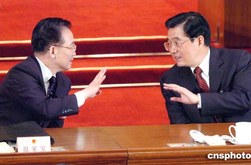 三月十三日上午,十屆全國(guó)人大三次會(huì)議第四次全體大會(huì)在北京人民大會(huì)堂舉行,人大代表投票選舉中華人民共和國(guó)中央軍事委員會(huì)主席。圖為胡錦濤與溫家寶在主席臺(tái)上交談。作者:陳文