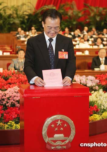 十屆全國人大三次會(huì)議第四次大會(huì)三月十三日在北京人民大會(huì)堂舉行,胡錦濤在會(huì)上當(dāng)選為中華人民共和國中央軍事委員會(huì)主席。圖為國務(wù)院總理溫家寶投票。作者:毛建軍