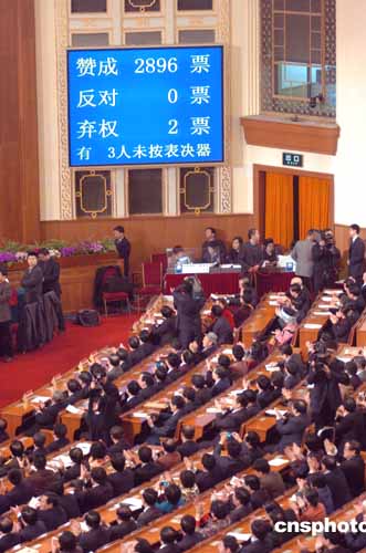 中新網(wǎng)3月14日電 在今天上午舉行的十屆全國(guó)人大三次會(huì)議閉幕會(huì)上,《反分裂國(guó)家法》以2896票贊成、0票反對(duì)、2票棄權(quán)獲表決通過。