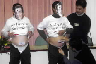 中新網(wǎng)3月14日電 “319槍擊案”發(fā)生將屆滿一周年,臺灣的“國策會”13日舉辦研討會,找來5名體型和陳水扁相似的志愿民眾,依照刑事局和李昌鈺的鑒識報告,把褲子穿在肚臍以下8厘米的位置,而內(nèi)褲則穿在肚臍以下14厘米的位置;藉此諷刺陳水扁“319”當天穿著“低腰褲”,掃街拜票;更抨擊鑒識報告的公正性。