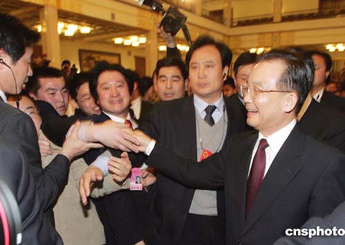 十屆全國(guó)人大三次會(huì)議三月十四日在北京人民大會(huì)堂閉幕,國(guó)務(wù)院總理溫家寶在閉幕會(huì)后舉行記者會(huì)。圖為溫總理在記者招待會(huì)結(jié)束后走到記者席前,與現(xiàn)場(chǎng)采訪的中外記者握手。作者:毛建軍