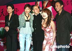 榮獲柏林電影節(jié)銀熊獎的臺灣電影《天邊一朵云》在全臺公映。該片因有暴露的性愛鏡頭而引起一些爭議。圖為3月18日晚,臺灣著名導演蔡明亮(中)與該片主要演員出席在臺北舉行的首映式。作者:董會峰