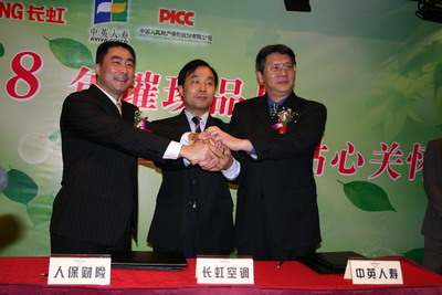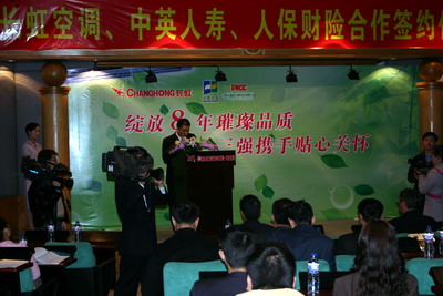 四川長虹電器股份有限公司黨委書記、副董事長劉體斌、中英人壽成都分公司總經理吳傳成、人保財險四川省分公司副總經理常川參加了簽字儀式,長虹空調公司總經理李進博士、中英人壽助理總裁常穎、長虹空調(中國)營銷公司市場推廣部部長余皓就雙方產品及聯(lián)合營銷事宜向新聞媒體作了介紹。
