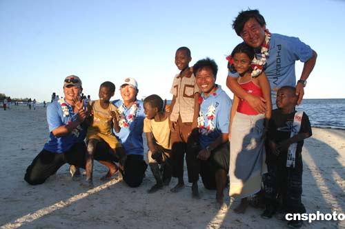 香港鳳凰衛(wèi)視“鳳凰號”單桅帆船完成鄭和下西洋航程十六日抵達(dá)肯尼亞蒙巴薩港,圖為“鳳凰號”隊(duì)員們十九日與肯尼亞兒童在一起。作者:邢健