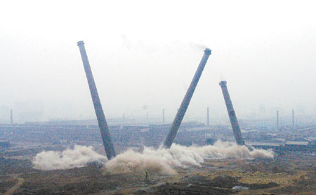 明天是2005年3月23日,原沈陽冶煉廠的3根百米煙囪拆除一周年;將日歷回翻365頁,2004年3月23日凌晨6點,在許多老工人留戀的目光中,在全國各地的注目下,沈陽老工業(yè)基地的標(biāo)志性建筑原沈陽冶煉廠的3座百米煙囪轟然倒地。