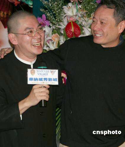 獲柏林電影節(jié)銀熊獎的影片《天邊一朵云》在全臺公映。該片因有暴露的性愛鏡頭而引起一些爭議。圖為3月18日晚,曾獲奧斯卡獎的名導(dǎo)演李安(右)在臺北出席該片首映式時,與該片導(dǎo)演蔡明亮相見甚歡。作者:董會峰