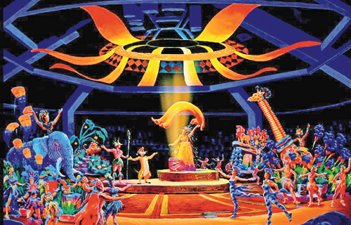 旅客亦可坐在一個(gè)容納二千二百人,以及有三百六十度觀景的劇院內(nèi)欣賞另一出歌舞劇“獅子王慶典”,八十五名演藝人員會(huì)在每天八次,每次三十分鐘的演出中,將《獅子王》的故事表演發(fā)揮得淋漓盡致。在歌舞劇中,旅客可聽到由Elton John演唱的“Can You Feel The Love Tonight?”,以及其它《獅子王》的經(jīng)典金曲。