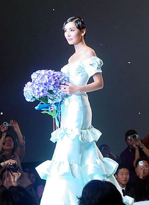 中新網(wǎng)3月24日電 據(jù)新聞晚報(bào)報(bào)道,昨天(23日)下午,在世貿(mào)商城的韓國時(shí)裝紡織博覽會(huì)上,韓國明星金素妍、鄭俊鎬身穿韓國頂級(jí)時(shí)裝大師AndreKim(安德烈·金)設(shè)計(jì)的最新服裝舉行了一場別開生面的婚紗秀,贏得了中國影迷的熱烈歡呼。下午三點(diǎn),婚紗秀現(xiàn)場正式開放,爭相涌進(jìn)的觀眾讓表演現(xiàn)場一時(shí)陷入癱瘓。主辦方不得不現(xiàn)場趕人,沒有邀請函的觀眾一律“清理”。當(dāng)金素妍和鄭俊鎬雙雙出現(xiàn)在舞臺(tái)上時(shí),歡呼聲伴隨著閃光燈爆發(fā)出來,出現(xiàn)了仿佛是搖滾樂演唱會(huì)的情景。特別是當(dāng)鄭俊鎬輕吻金素妍前額時(shí),一些女影迷當(dāng)場流出了熱淚。
